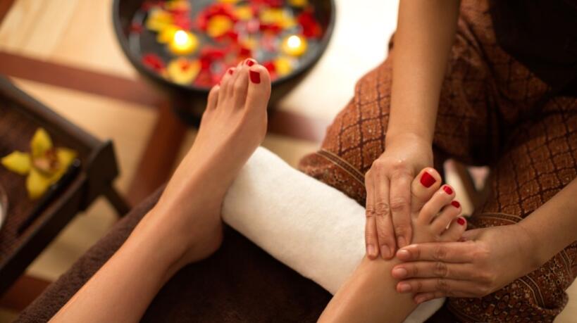 护理前准备:进行法式净足礼,选用玫瑰花瓣与牛奶泡脚;客人可根据喜好选择精油香型,护理前在私人 SPA 池泡浴 15 分钟,放松身心。